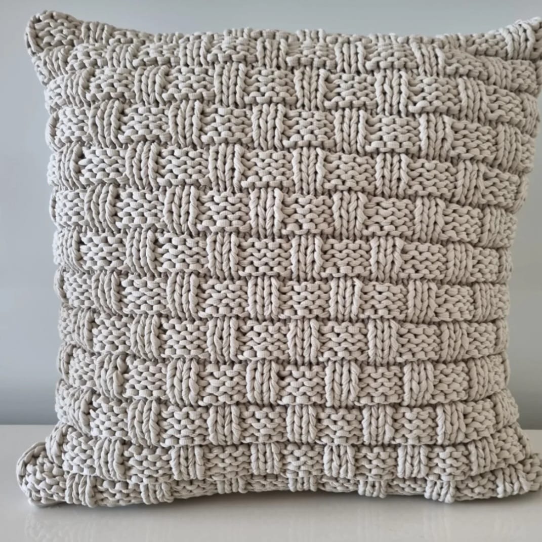 Almofada tecida em tricô, com fio de malha de poliéster.