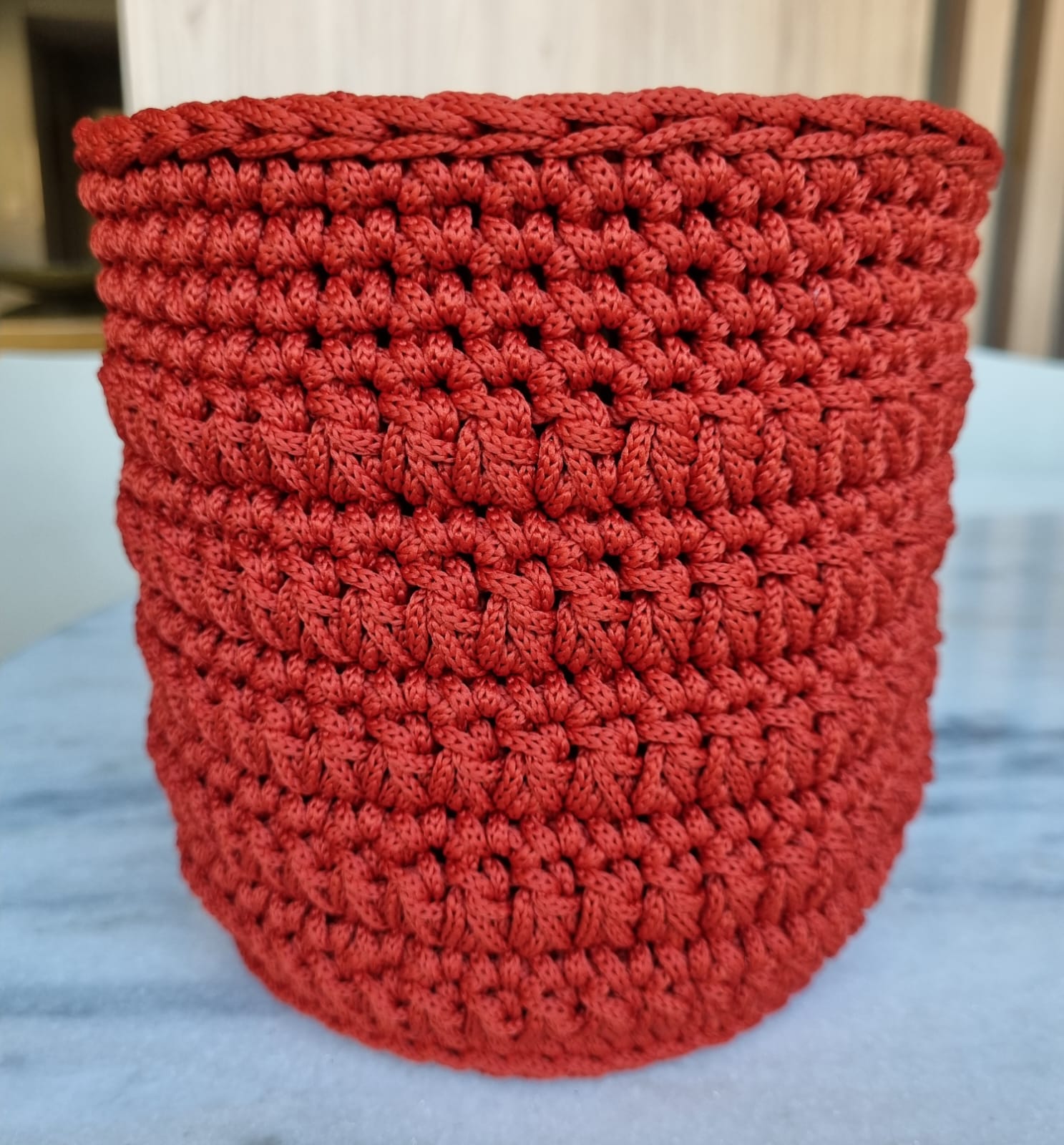 Cachepô Redondo Barroco, tecido em crochê com fio de poliéster. Possui pote interno em polipropileno para impedir a saída da água.
